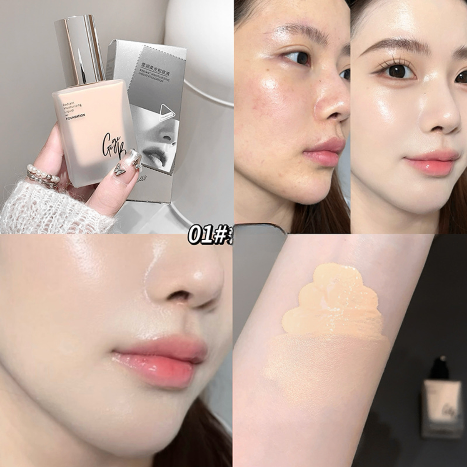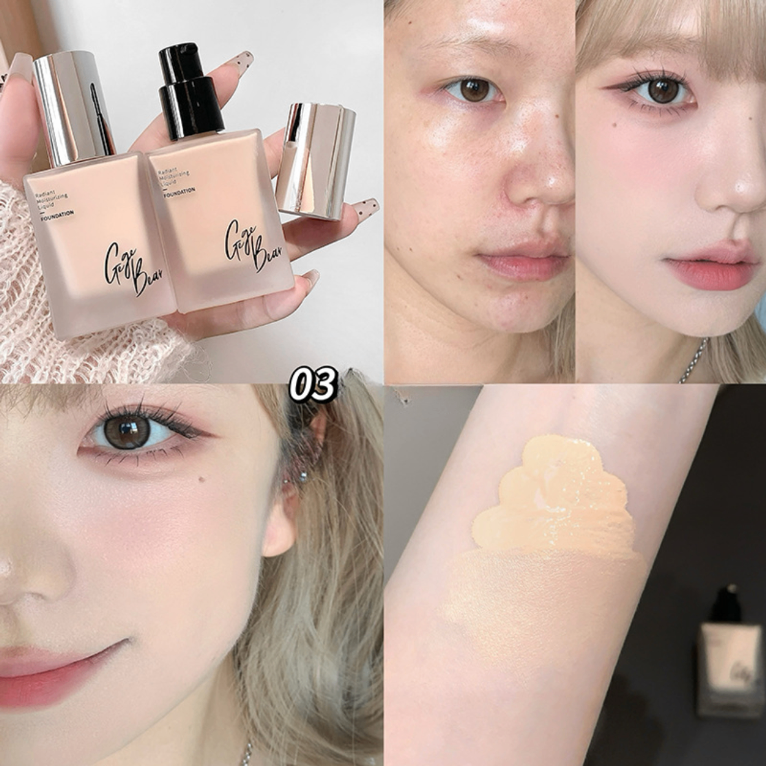 Gege Bear Radiant Moisturizing Liquid Foundation нь арьсыг чийгшүүлж, жигд, толигор харагдуулах зориулалттай шингэн тональ крем юм. Хөнгөн, шингэн бүтэцтэй тул арьсан дээр хүнд мэдрэмж төрүүлэхгүй, жигд тараж натурал финиш өгнө.